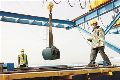 在河南省焦作市溫縣的國(guó)道207焦溫快速通道項(xiàng)目南水北調(diào)中線干渠跨渠橋梁施工現(xiàn)場(chǎng),建設(shè)者在進(jìn)行吊裝作業(yè)。 (圖片來源:人民視覺)