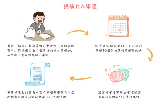 以提前介入審理為例,該規(guī)范明確,對于重大、疑難、復(fù)雜案件或者對違紀(jì)行為性質(zhì)認(rèn)定分歧較大的案件,符合規(guī)定條件需要提前介入審理的,相關(guān)審查調(diào)查部門應(yīng)當(dāng)在報分管委領(lǐng)導(dǎo)同志審批后,于正式移送審理10日前與案件審理室溝通,經(jīng)案件審理室形式審核確定是否符合提前介入審理條件。審查調(diào)查部門應(yīng)當(dāng)對案件審理室提前介入后所提意見建議及補證情況進行書面說明。