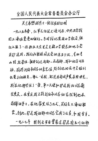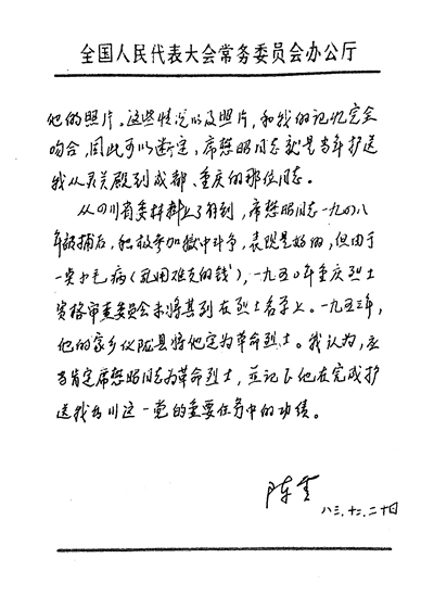從四川省委材料上了解到,席懋昭同志一九四八年被捕后,積極參加獄中斗爭,表現(xiàn)是好的……我認(rèn)為,應(yīng)當(dāng)肯定席懋昭同志為革命烈士,并記下他在完成護(hù)送我出川這一黨的重要任務(wù)中的功績。