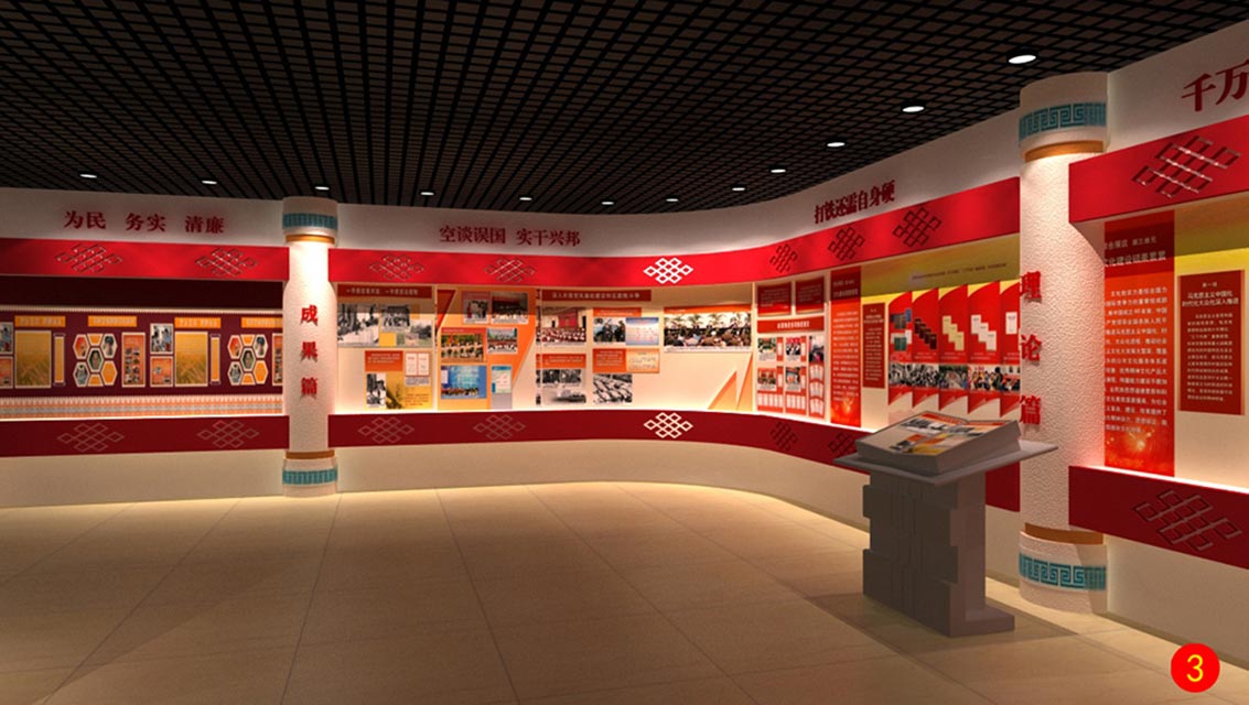 該基地較好地將蒙元文化特色融入基地設(shè)計(jì)中,展廳主題鮮明,集 “參觀、展覽、宣誓、教育”等多種功能為一體,為暢通流線一體化參觀模式。館內(nèi)充分利用聲、光、電等現(xiàn)代科技手段,結(jié)合網(wǎng)絡(luò)信息技術(shù),圖文并茂、聲情相融、結(jié)合現(xiàn)象剖析本質(zhì),以案警人,具有較強(qiáng)的科技感和互動(dòng)性。
