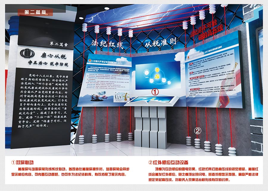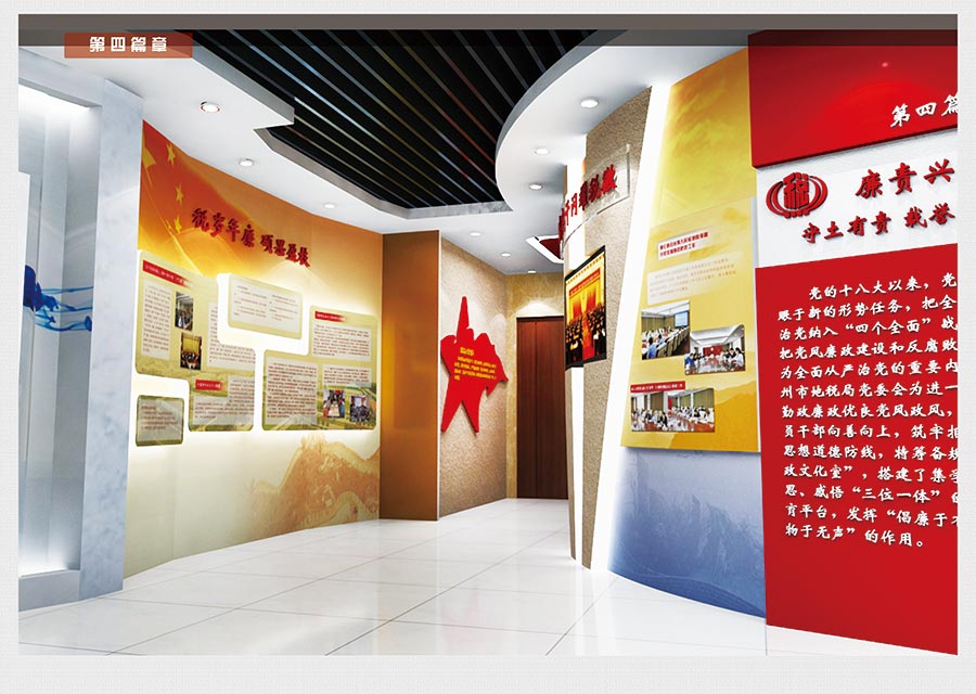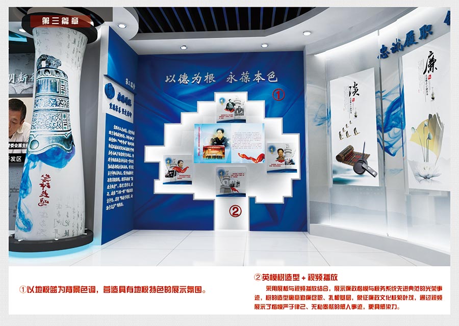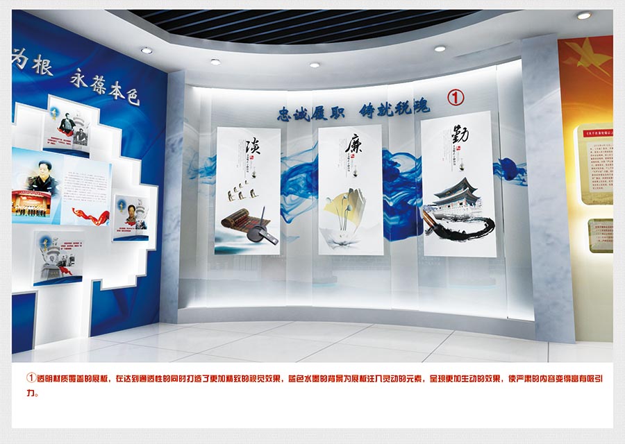 所展示的內(nèi)容立足手稅務工作實院,注重廉政教育的針勸性和實效性,包含了黨員工部的作風修養(yǎng)、稅務人員的從業(yè)要求、廉政文化的建設成果等。后期效果在設計上會配合文字方案,因地制自體現(xiàn)地方猜色,版面背景設計選用當?shù)靥厣?,達到廉政文化主題與當?shù)貐^(qū)域發(fā)展特色相融合的效果。