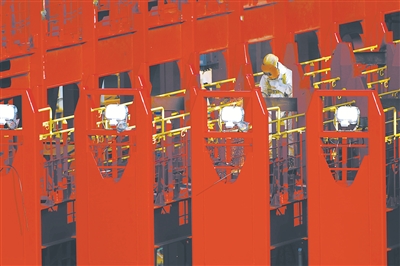 圖②:施工人員正在焊接“長益”號的綁扎橋。 張黎 攝