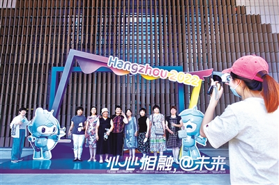 圖為市民參觀富陽(yáng)銀湖體育中心并合影留念,該中心為杭州亞運(yùn)會(huì)射擊、射箭、現(xiàn)代五項(xiàng)比賽場(chǎng)地。 中新社記者 錢(qián)晨菲 攝