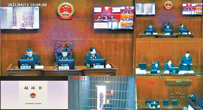 2021年4月13日,成都市中級(jí)人民法院一審開庭審理?xiàng)詈榕e涉嫌受賄罪一案。圖為庭審現(xiàn)場(chǎng)(視頻截圖)。 (成都市紀(jì)委監(jiān)委供圖)