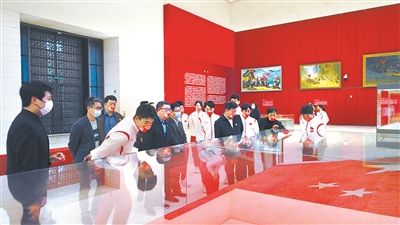 4月18日下午,中國冰雪健兒參觀中國國家博物館“復(fù)興之路”展覽。圖為國家體育總局冬季運(yùn)動(dòng)管理中心有關(guān)負(fù)責(zé)人與運(yùn)動(dòng)員、教練員參觀中華人民共和國第一面五星紅旗。瞿芃 攝