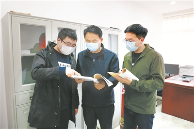 遼寧省盤錦市紀(jì)委監(jiān)委第七紀(jì)檢監(jiān)察室四級(jí)主任科員馬寶華(中)和同事討論分析案情。 徐騰 攝