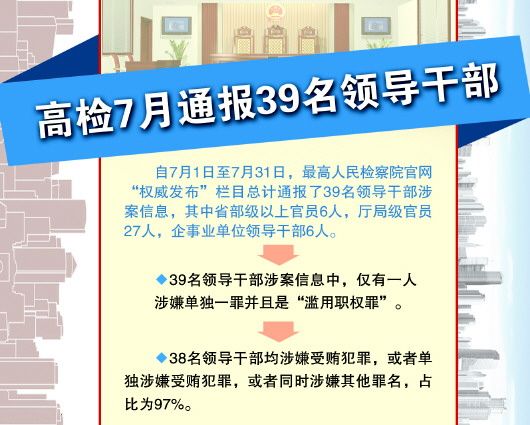 自7月1日至7月31日,最高人民檢察院官網(wǎng)“權(quán)威發(fā)布”欄目總計通報了39名領(lǐng)導干部涉案信息。