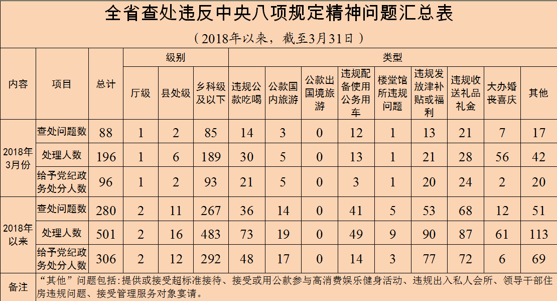 2018年3月,浙江全省各級(jí)紀(jì)檢監(jiān)察機(jī)關(guān)共查處違反中央八項(xiàng)規(guī)定精神問題88起,處理196人,給予黨紀(jì)政務(wù)處分96人,其中,違規(guī)收送禮品禮金問題21起,違規(guī)公款吃喝問題14起,違規(guī)發(fā)放津補(bǔ)貼或福利問題13起,違規(guī)配備使用公務(wù)用車12起,這4類問題占查處問題總數(shù)的68.2%。從受黨紀(jì)政務(wù)處分人數(shù)看,廳級(jí)1人,縣處級(jí)2人,鄉(xiāng)科級(jí)及以下93人,其中鄉(xiāng)科級(jí)及以下占96.9%。