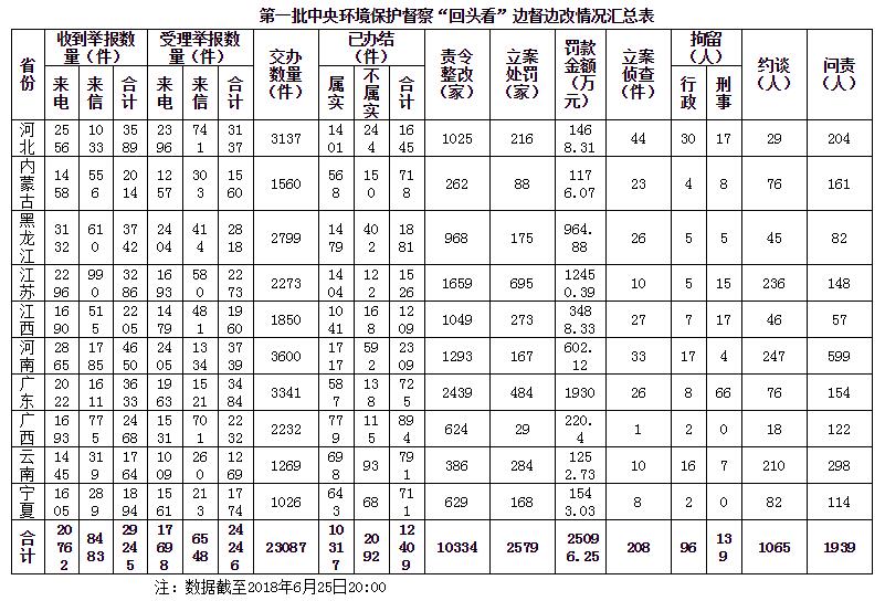 截至6月25日晚20:00,6個督察組共收到群眾舉報29245件,受理有效舉報24246件,經(jīng)梳理合并重復(fù)舉報,累計向被督察地方轉(zhuǎn)辦交辦23087件;各被督察地方完成查處12409件,其中立案處罰2579家,罰款25096萬元;立案偵查208件,拘留235人;約談1065人,問責(zé)1939人。但從各被督察地方報送情況看,廣東群眾舉報辦結(jié)率偏低;黑龍江、河南群眾舉報不實問題占比較高;廣西、寧夏尚無因環(huán)境違法犯罪而拘留的人員。這些需要引起當?shù)攸h委、政府高度重視。