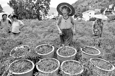 貴州省思南縣塘頭鎮(zhèn)青杠壩村位于武陵山深處,過去因?yàn)榻煌ㄩ]塞、自然條件惡劣,村民農(nóng)閑時節(jié)只能靠編草鞋等增加收入,是當(dāng)?shù)剡h(yuǎn)近聞名的“草鞋村”。目前,青杠壩村農(nóng)民人均年可支配收入達(dá)1.5萬元,集體經(jīng)濟(jì)年收入突破600萬元。如今,青杠壩已摘掉了“草鞋村”的窮帽子,成了民富村美的“小康村”。圖為青杠壩村村民們采摘用作生產(chǎn)糟辣椒的紅辣椒。 新華社記者 楊文斌 攝