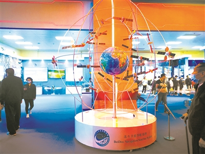 國家“十三五”科技創(chuàng)新成就展現(xiàn)場的北斗衛(wèi)星導(dǎo)航系統(tǒng)模型。 本報記者 王雅婧 攝
