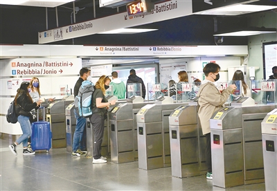 針對疫情形勢,意大利將室內(nèi)強制口罩令延長至6月15日,民眾進入醫(yī)院、療養(yǎng)院等場所以及乘坐公共交通工具時仍需佩戴口罩。圖為近日,羅馬市民在通過地鐵站檢票口。 新華社記者 金馬夢妮 攝