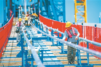 深中通道建設者在進行伶仃洋大橋主纜架設施工。蘇振飛 攝