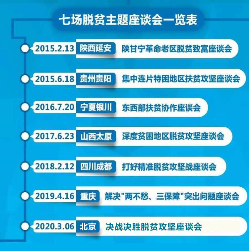 這是習(xí)近平總書(shū)記2015年來(lái)第七次針對(duì)扶貧工作召開(kāi)座談會(huì)。習(xí)近平總書(shū)記在七場(chǎng)座談會(huì)上分別就革命老區(qū)脫貧致富、集中連片特困地區(qū)扶貧攻堅(jiān)、東西部扶貧協(xié)作、深度貧困地區(qū)脫貧攻堅(jiān)、打好精準(zhǔn)脫貧攻堅(jiān)戰(zhàn)、解決“兩不愁三保障”突出問(wèn)題、決戰(zhàn)決勝脫貧攻堅(jiān)等發(fā)表重要講話(huà)。這一系列講話(huà)成為指導(dǎo)中國(guó)打贏脫貧攻堅(jiān)戰(zhàn)的重要思想、重要部署、重要保障。七次座談會(huì),七次不同重點(diǎn),習(xí)近平總書(shū)記都談了哪些內(nèi)容?作出哪些部署?